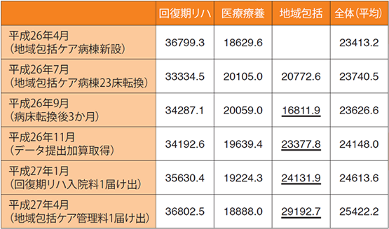 地域医療包括ケア病床に移行したことで、1日あたりの入院単価は一時、ガクンと下がった。もっとも落ち込みが激しかったのは転換3ヵ月目の1万6811円で、医療療養病床の2万59円より3000円以上も低い。在宅復帰率が足りず、大部分が低い医療区分での算定となったためだ。しかし、5ヵ月目には2万3377円となり、同時期の医療療養病床の1万9639円を上回った。 「地域包括ケア病床の施設基準を満たすために人件費も増えましたから、当初は非常に苦しい時期でした。ただ、回復期リハビリ病棟の入院単価が常に3万5000円前後と高水準だったため、何とか耐えられました」