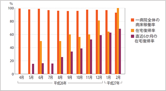 当初は、診療報酬の算定要件が比較的ゆるやかな「地域包括ケア病棟入院医療管理料2」で届け出た。その後、着々と実績を積み、翌15年4月には、より診療報酬の高い「同入院医療管理料1」を取得。算定要件の在宅復帰率70%を満たしたのだ。
