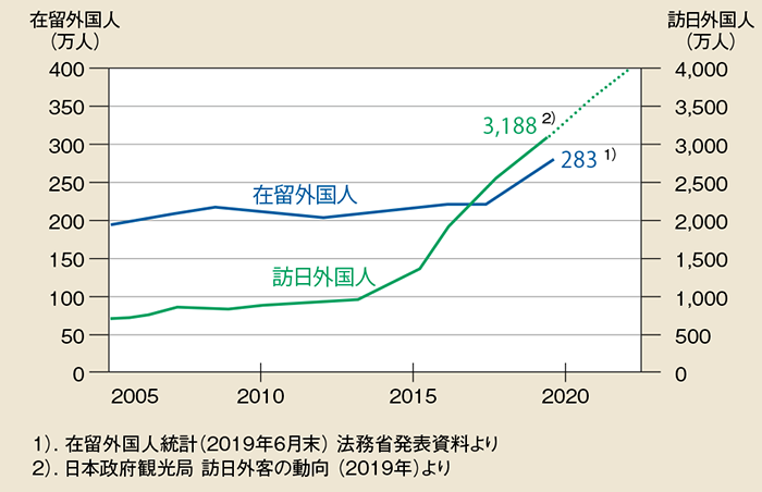 - 図表1● 日本の在留外国人・訪日外国人数の推移
