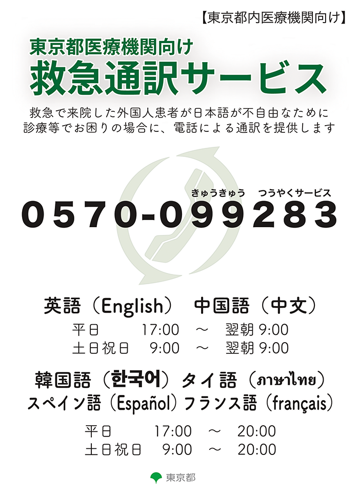 「東京都の場合は平日夜間と土日祝日の救急対応のみですが、無料の電話通訳サービスを提供しています。ほかの地域も行政のサポートがないか確認してみてください」(図表4)