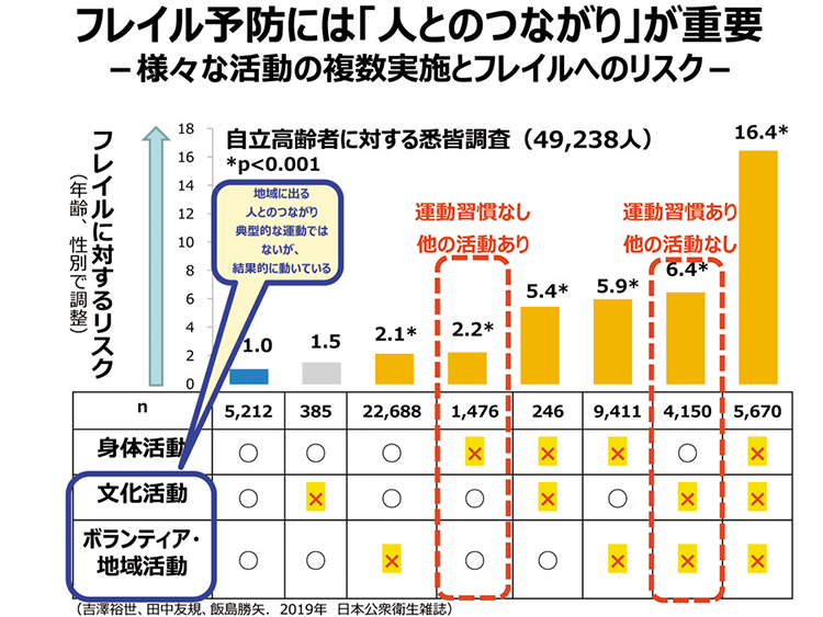 まず、フレイルの評価に科学的根拠を持たせるために、千葉県柏市で大規模高齢者コホート研究を実施。“栄養”“身体活動”“社会参加”の3要素がフレイル予防の柱となること(図表2)、これらを複合的に採り入れることで発症リスクが低減できること、とくに“地域に出て、人とのつながりを持つ”ことが重要であることなどを実証した(図表3)。