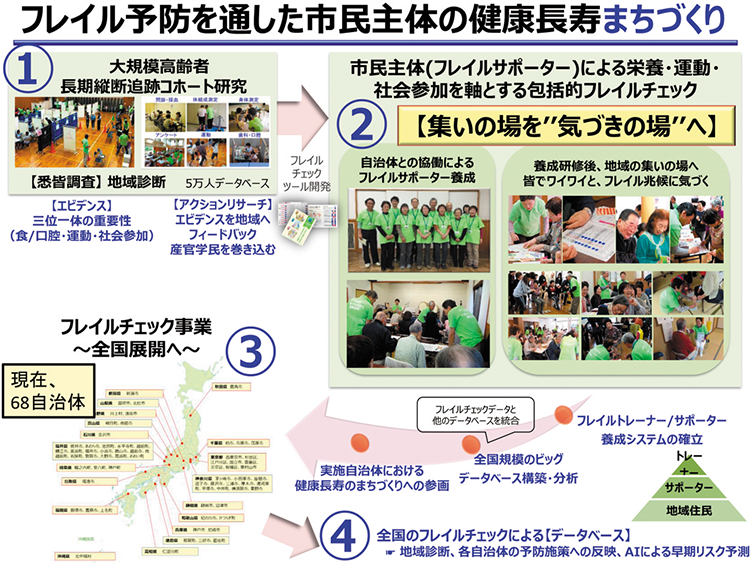 循環器専門医、老年病専門医と医師としてのステップを踏んできた飯島勝矢氏。次なるステージに東京大学高齢社会総合研究機構教授として “まちを治す医者”を選択した理由の一つに、“高齢者のヘルスケアは医療界の力だけではマネジメントできない”ことへの気づきがある。そこで、医師ならではの視点を活かしつつ、“市民に継続的な活動が促せていない”という従来の介護予防事業の反省点を解決すべく飯島氏が考案し、現在、約70の自治体で展開されているのが『フレイル予防を通した健康長寿のまちづくり』だ。「これは、地域の元気シニアをフレイルサポーターとして養成し、市民主体のフレイルチェック活動によって、“集いの場を気づきの場へと変える”ことを目指すものです」(飯島氏)