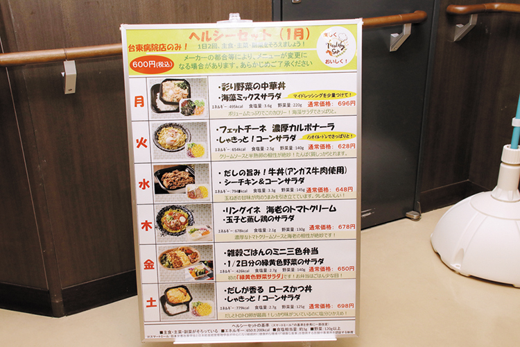 「既存の弁当やサラダを組み合わせ、主食・主菜・副菜のそろう、野菜が多く食塩含有量の少ない『ヘルシーセット』を作り、職員の福利厚生として五百円均一に割り引いて提供しています」(同センター川畑氏)