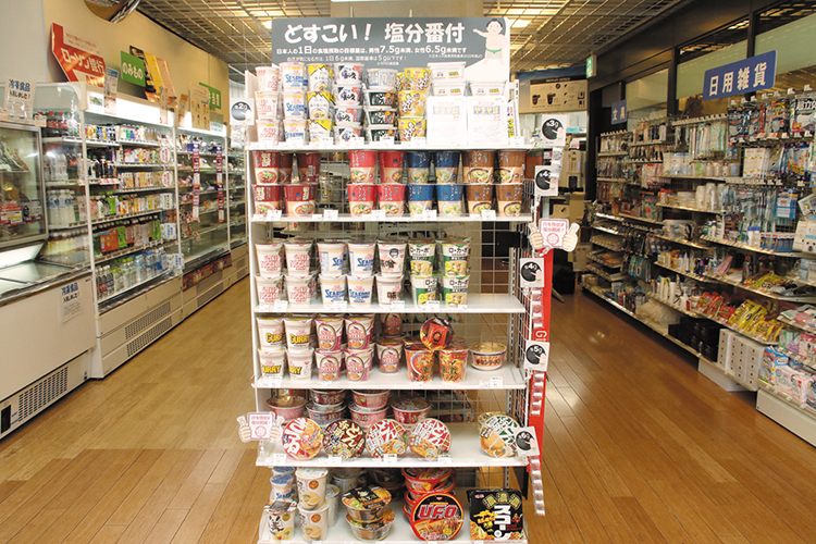 カップ麺等は、食塩量別に教育的な陳列を実施。