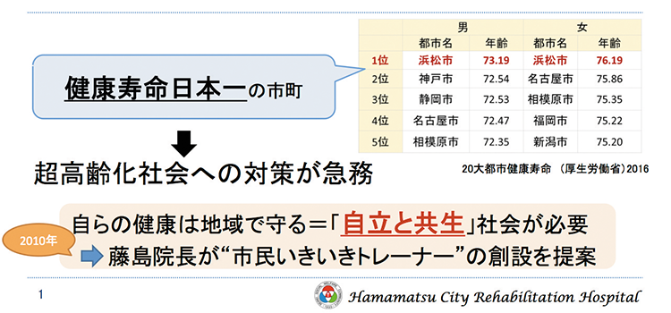 温暖な気候、日照時間の長さ、就労・社会参加の機会の豊富さなどがその理由として考えられているが、浜松市リハビリテーション病院長の藤島一郎氏は、「医療・介護施設が充実し、連携がスムーズな点も少なからず貢献していると考えられるが、何より、チャレンジ精神旺盛な住民気質を指す“やらまいか精神”が良い効果をもたらしているのでは」とみている。