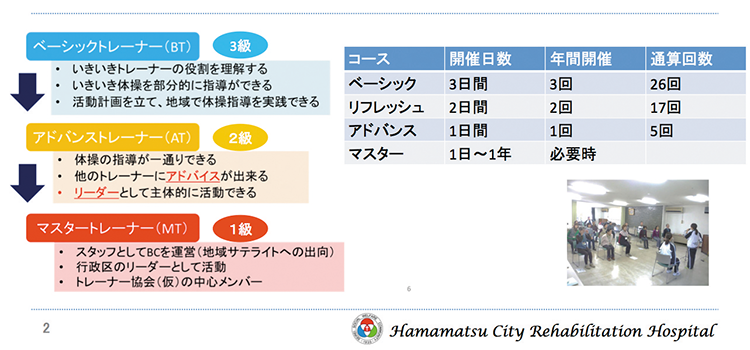 トレーナー養成講座は50歳以上80歳未満の心身ともに健康な浜松市民を対象としており、ベーシック・アドバンス・マスターの3コースから成る。レベルはベーシックトレーナー(BT)、アドバンストレーナー、マスタートレーナーに分かれており(図表2)、たとえばBTがリフレッシュコースを受講し、いくつかの基準を満たせばアドバンスコースを受講できるしくみだ。