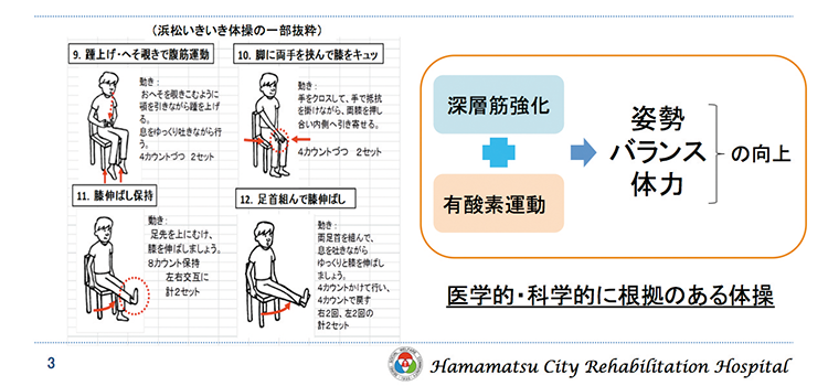 「浜松にはすでに骨折・転倒防止を目的とした『ロコモトレーニング』がありますが、リハビリテーションの視点で考案され、医学的・科学的根拠のある『浜松いきいき体操』は、“けがをせずに、効率よく”を重視しています」(藤島氏、図表3)