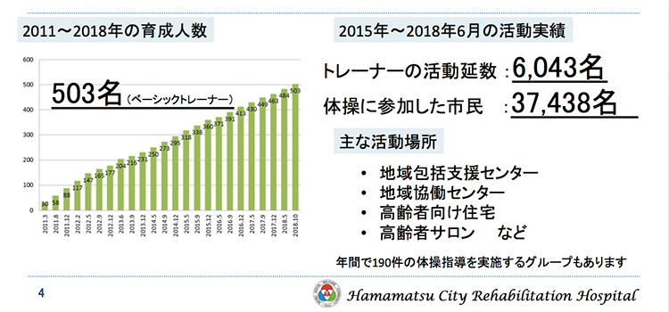 リハビリテーション医学は対照群の設定が困難で、エビデンスを確立しにくい領域ではある。しかし、活動を開始してから18年までに5百名を超えるトレーナーを輩出しており、彼らの活動の延べ数は6千を超え、体操に参加した市民の数に至っては約4万ほどにもなっており、活動が着実に浜松市民の間で広がりをみせているのは間違いない(図表4)。