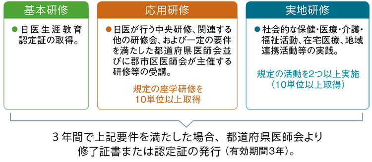 まず、「基本研修」として日医の生涯教育制度に則り、規定の単位・コードを取得して『日医生涯教育認定証』を受ける。次なる「応用研修」では、日本医師会や都道府県・郡市区医師会等が実施する研修を受講して、既定の単位を取得する。このうち、年度ごとに内容の替わる日本医師会中央研修では、たとえば認知症への対応やフレイル予防、感染対策、在宅医療・緩和医療など、時代に合った“是非身につけたい”テーマが採り上げられている。さらに「実地研修」では、学校医や休日・夜間診療への従事、市民向けの講演活動など、社会的な保健・医療活動の実践が求められる。以上の要件を満たすと、修了証書または認定証が授与されるしくみだ(図表4)。