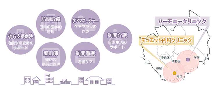 「ハーモニークリニックは在宅患者の約2割ががんの患者さんで、数年前と比べて緩和ケアが増えている」(中井氏)といい、同院副院長の市川聡子氏も「最近は病院での抗がん剤治療と併診しながら対応するケースが増え、より早期から関わることができるようになり、患者さんの希望を叶えるお手伝いが可能になってきている」のを感じている。一方、武蔵浦和にあるデュエット内科クリニックはいわゆる“埼玉都民”が多い。大和氏は「入院の短期化で細かな退院調整が困難になるなか、当法人が紹介先として選ばれる理由の一つは、良くも悪くも退院後の調整を“丸投げできる”力を持った多職種連携体制があるから」(図表6)とみる。