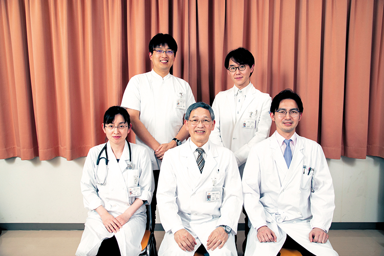 - 中根氏(中央)ほかハーモニークリニック副院長・中井秀一氏(前列右)、同副院長・市川聡子氏(前列左)、デュエット内科クリニック院長・大和康彦氏(後列左)、医療法人明医研医局長・松林洋志氏(後列右)