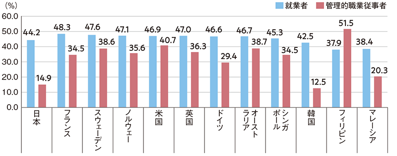 3.総務省「労働力調査」では,「管理的職業従事者」とは,就業者のうち,会社役員,企業の課長相当職以上,管理的公務員等。また,「管理的職業従事者」の定義は国によって異なる。