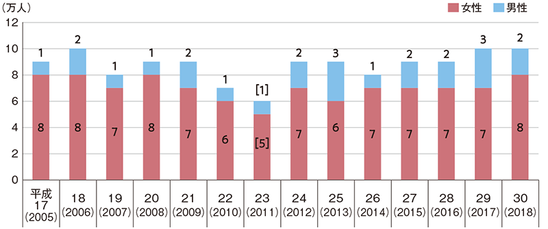 - 図2● 介護・看護を理由とした離職者の推移(令和元年度版男女共同参画白書)
