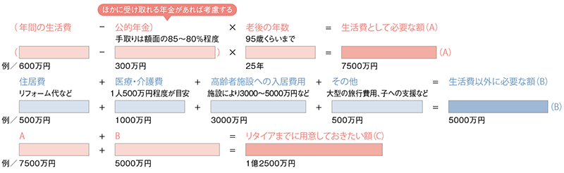 年間の生活費から、公的年金の額を引いた額が、生活費の不足額であり、95歳程度までの年数を乗じたものが、生活費として準備しておきたい額となる。ここに、リフォーム代や医療・介護費、高齢者施設への入居費用など、生活費とは別に必要な額を加えたのが、リタイアまでに用意したい額だ。退職金や任意で加入している年金(保険医年金や個人年金保険など)があれば、必要額から差し引ける。