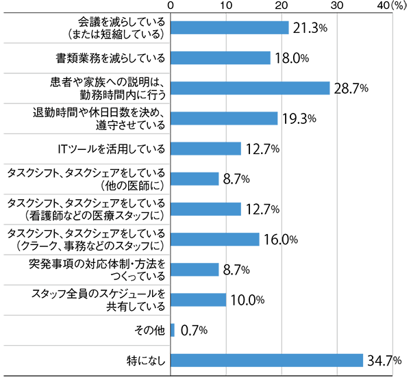 「目標設定をしている」(19・3%)、「1日を振り返り、改善点を検討」(13・3%)と、自分の内面にかかわる回答はあまり多くはなかったが、「今週までにこれは終わらせるといった短期間の簡単な目標を立てる」と、意識的に取り組む医師もいるようだ。