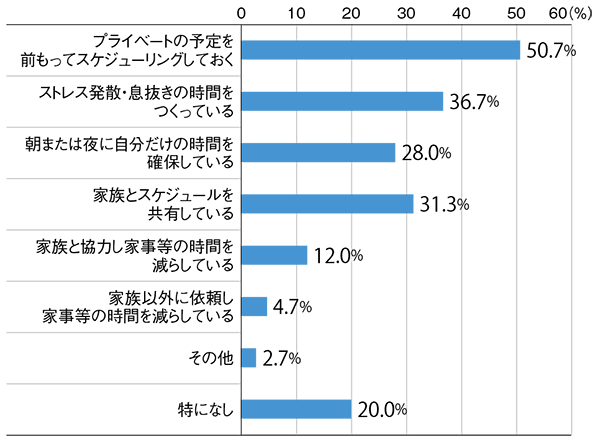 次に回答が多かった項目は「ストレス発散・息抜きの時間を作る」(36・7%)。一般に、時間管理は単に時間を捻出するだけでなく、その時間を有効活用できてこそ成功とする向きがある。読者からは、息抜きの時間を音楽や運動などにあてているという声が寄せられた。「アフター5は全力で趣味に打ち込んだり、愚痴を言い合ったりして、ストレスはその日のうちに全て解消」という回答もあった。