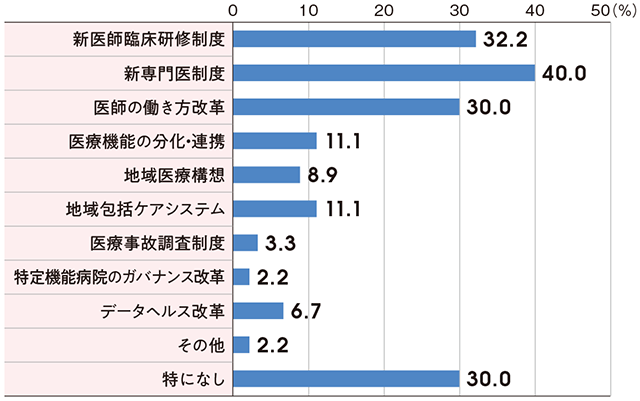 医療制度の変遷を振り返ると、医師のキャリアにかかわる改定は幾度も行われてきた(下年表)。弊誌読者のアンケートでは、キャリアに影響を与えた制度改定として2004年の「新医師臨床研修制度」(32・2%)、18年の「新専門医制度」(40%)、19年の「医師の働き方改革」(30%)を挙げる回答が多かった(下グラフ)。