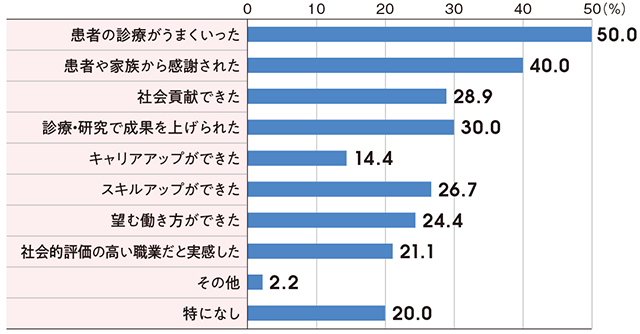 Q2「今までのキャリアでやりがいや幸せを感じたのはどんな時?」では、「患者の診療がうまくいった」(50%)が最多で、次に「患者や家族から感謝された」(40%)が多かった。自身の利益になる「キャリアアップ」(14・4%)や「社会的評価」(21・1%)などは比較的少ない。フリーコメントでは、「患者に感謝されるのはいつになっても嬉しい」(一般外科・40代前半・男性)など、“感謝”という言葉が非常に多く並んでいた。医師の仕事は、診療・研究・教育と多岐にわたるが、最終的には「患者が治り、感謝される」というシンプルな事象につながることが、幸せの根源のように見受けられる。