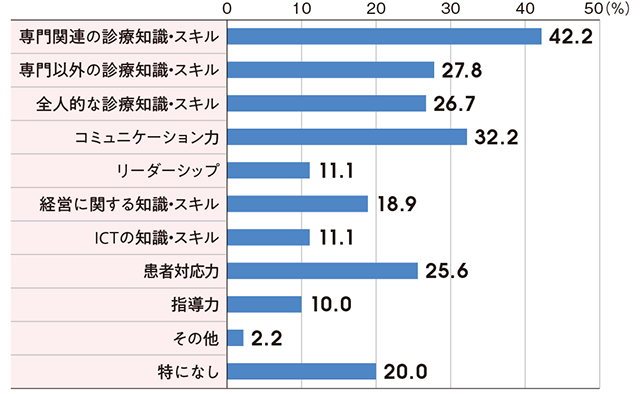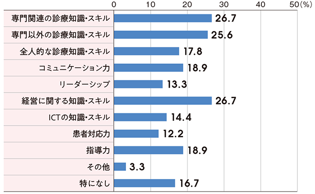 Q4「今後、身につけたい知識・スキル」は、「専門関連の知識・スキル」と「経営に関する診療知識・スキル」が共に26・7%で最多だった。経営に関心を持つ理由に、将来の開業を挙げるコメントが散見されるが、「経営なくしては成り立たないし、その環境はより厳しくなってきている」(一般内科・50代前半・男性)という声もあった。医療機関の収入は国民皆保険制度で支えられているとはいえ、今後の状況をシビアに見ている医師もいるようだ。
