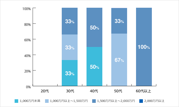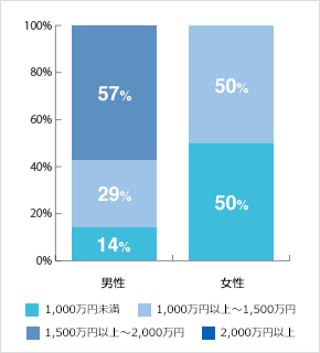 男性の場合、「1,000万円以上~1,500万円未満」の割合が29%、「1,500万円以上~2,000万円未満」の割合が57%となっており、他の診療科に比べて低すぎるとまではいえない程度の年収水準です。一方、女性の場合は、「1,000万円未満」と「1,000万円以上~1,500万円未満」が50%ずつとなっています。
