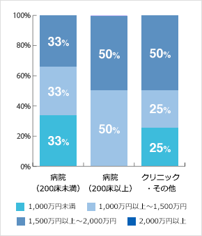 全体的に「1,500万円以上~2,000万円未満」をピークとして、幅広い年収帯にばらけています。施設の種類や規模による年収水準の差はみられません。医師の年収水準としてはさほど高いとはいえないような状況であり、ワークライフバランス、社会貢献性、使命感など、年収とは別のところにも価値を見出してキャリア選択する方が多いのかもしれません。